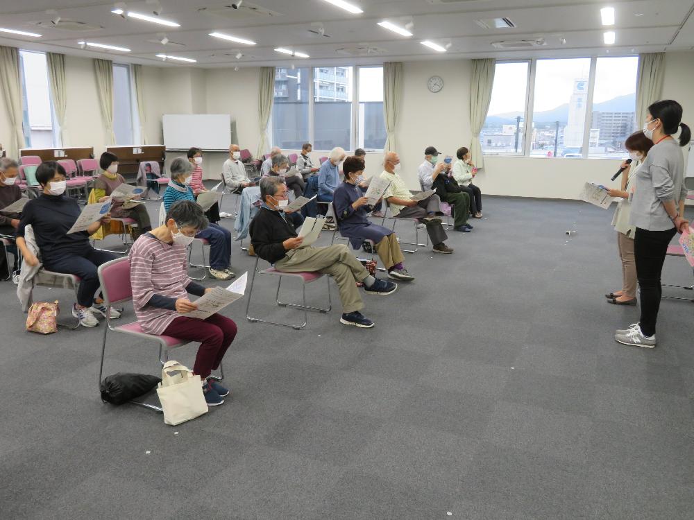 体操が終わったあと、草津地域包括支援センターの職員と草津市の保健師より、地域包括支援センターの役割りについて説明していただきました。以前は、草津ケアセンターの中にあったのですが、今は草津商店街にある滋賀銀行の隣に移転したということや、万一家族が認知症になったときなど気軽に介護について相談できるところだということが分かりました。