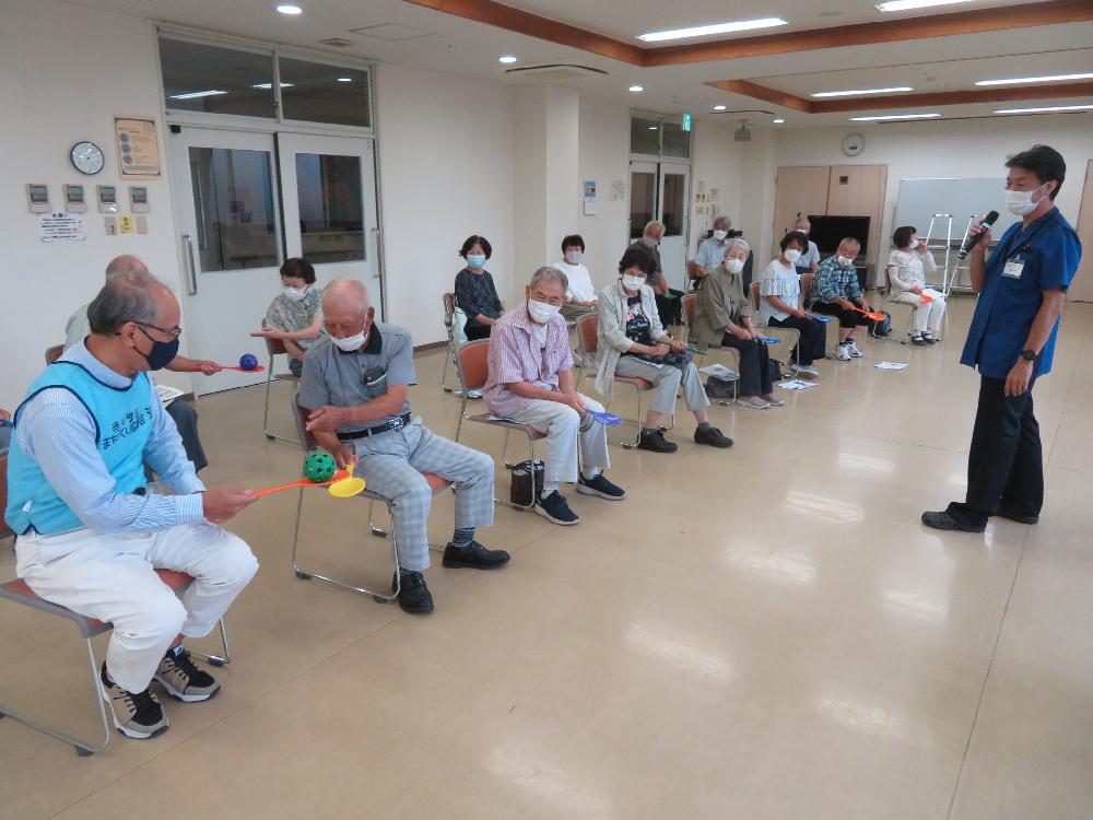 当日は、講師として草津ケアセンターから介護リハビリテーション課長の濱田康夫さんをお迎えし、ボウリングや脳トレ大判かるたなどの使い方や注意点などについて説明していただきました。