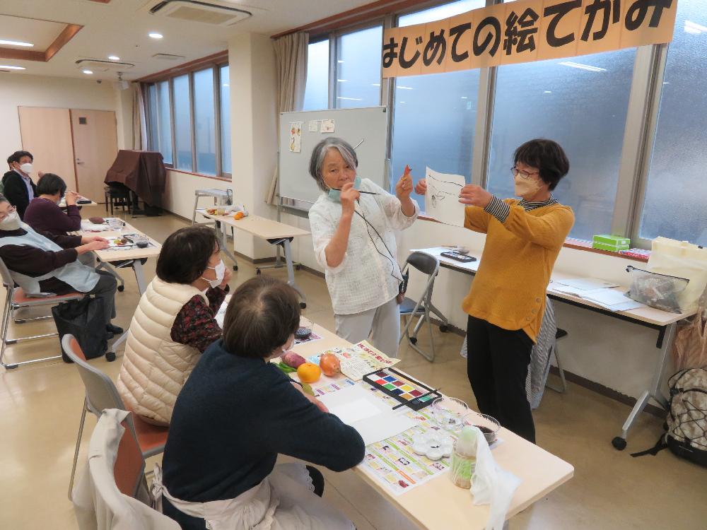 11月1日(火曜)に、健康福祉部会主催で「はじめての絵てがみ」を開催しました。講師の小松原晴子さんに教わりながら、秋ならではの柿や栗、落ち葉などを画仙紙のはがきに描きました。