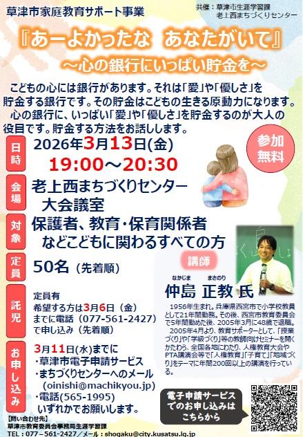 大人気の教育サポーター、仲島 正教さんの講演会です。