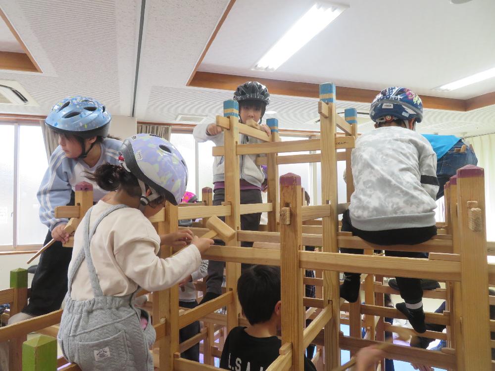 国産材でできた柱や横材を組んで楽しむ木育玩具です。優しい木目や匂い、肌触り、木づちがひびく心地よい音などを五感をとおして木のぬくもりを感じながらみんなで協力して大きなジャングルジムを組み立てました。