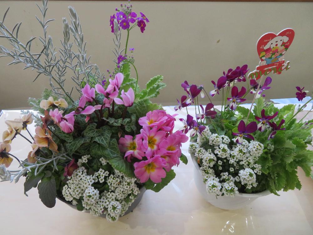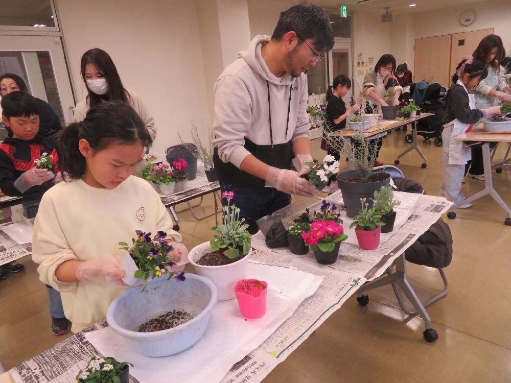 各自で苗の配置を考えたり土に触れたりして1つの鉢に何種類かの植物を一緒に植えて、季節の花を楽しむことができました。家で美しく育てるポイントを教わりました。これからお世話をし、苗が大きく育ってゆく様子を楽しんでいただければと思います。