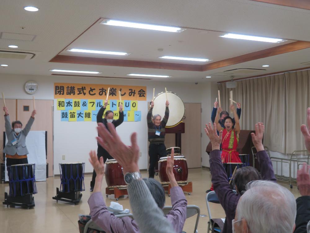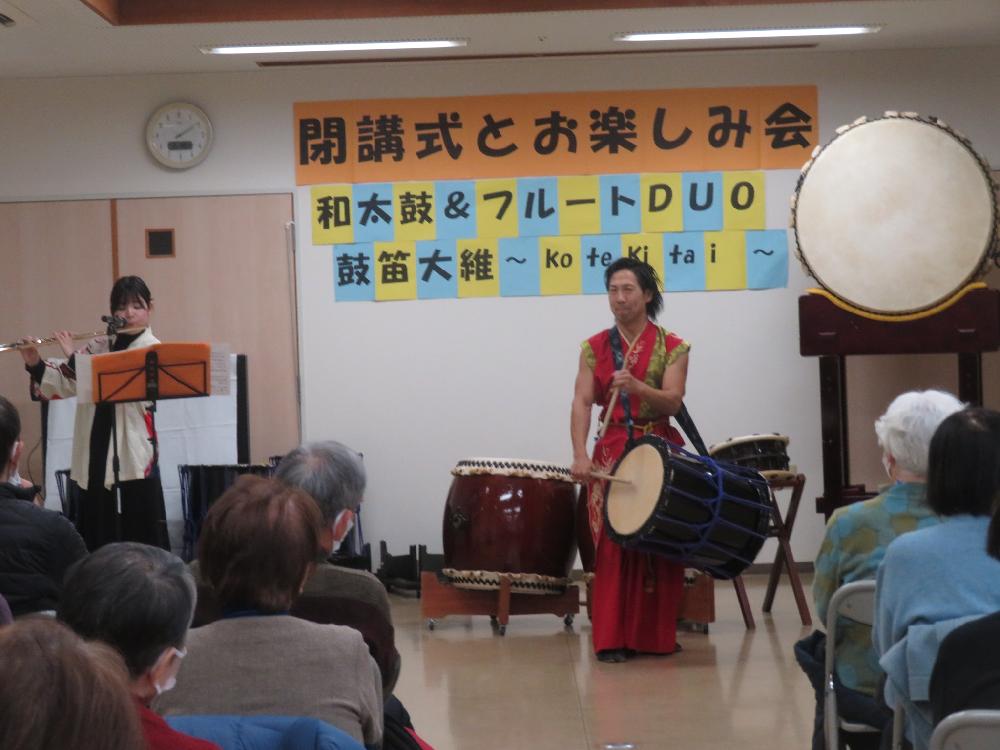 閉講式のあと、「和太鼓&フルートDUO鼓笛大維~kotekitai~」和太鼓演奏者・てんびん太鼓塾長の細田佳揮さん、フルート奏者の土佐 友理咲さんをお迎えして、クラッシック名曲メロディーや日本の歌など演奏していただきました。日本の伝統楽器である和太鼓が持っている大きな力強い演奏で心にとても響きました。またフルートの優美な音色と融合した演奏に聞き入っていました。