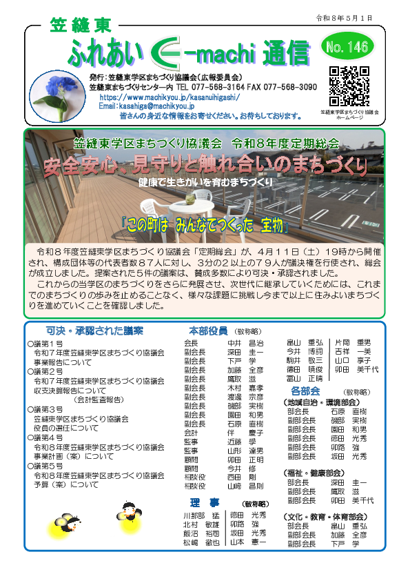 ふれあいE-machi通信第146号(令和8年5月1日)を発行しました。 【掲載内容】 ・笠縫東学区まちづくり協議会令和8年度定期総会 可決承認された議案 本部役員、理事、各部会 ・令和8年度笠縫東学区まちづくり協議会組織図 ・学区対策本部員 ・令和7年度決算 ・令和8年度予算 ・ふれあい親子サロン 親子で楽しむ「自分だけのカレンダー作り」 ・令和8年度笠縫東学区町内会長 ・ほたるフェスタ ・卒業式、修了証書授与式、卒園式 おめでとうございます! ・入学式、入園式 おめでとうございます! ・5月の行事予定 ・イベント情報 ふれあい親子サロン「5月はお花がいっぱい」 笠縫東学区で栽培した新鮮な野菜等の販売 受講生募集「わいわいクッキング”笠縫東”」 狂犬病の予防注射 笠縫東学区の人口等(令和8年度3月末現在) 笠縫東学区まちづくり協議会では、皆さんの身近な情報を提供するために定期的に情報誌を配布しています。 笠縫東まちづくりセンターで情報誌を直接受け取ることができます。