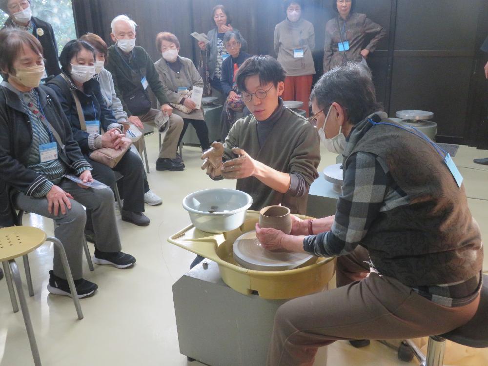 二代目の山元一真さんには、実際にろくろを回しながら粘土の扱い方を説明していただき、数人の受講生さんに体験してもらいました。指先、手の平で形を整えていくのは難しそうでしたが、良い経験ができたようでした。