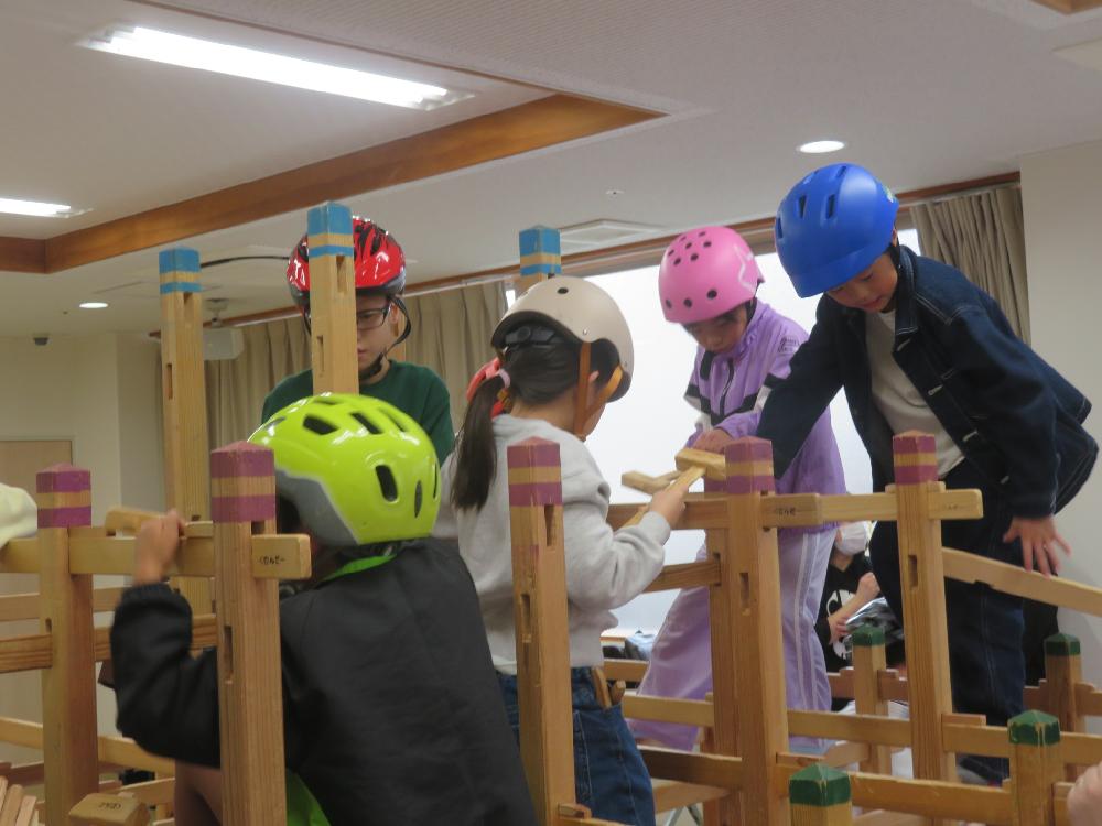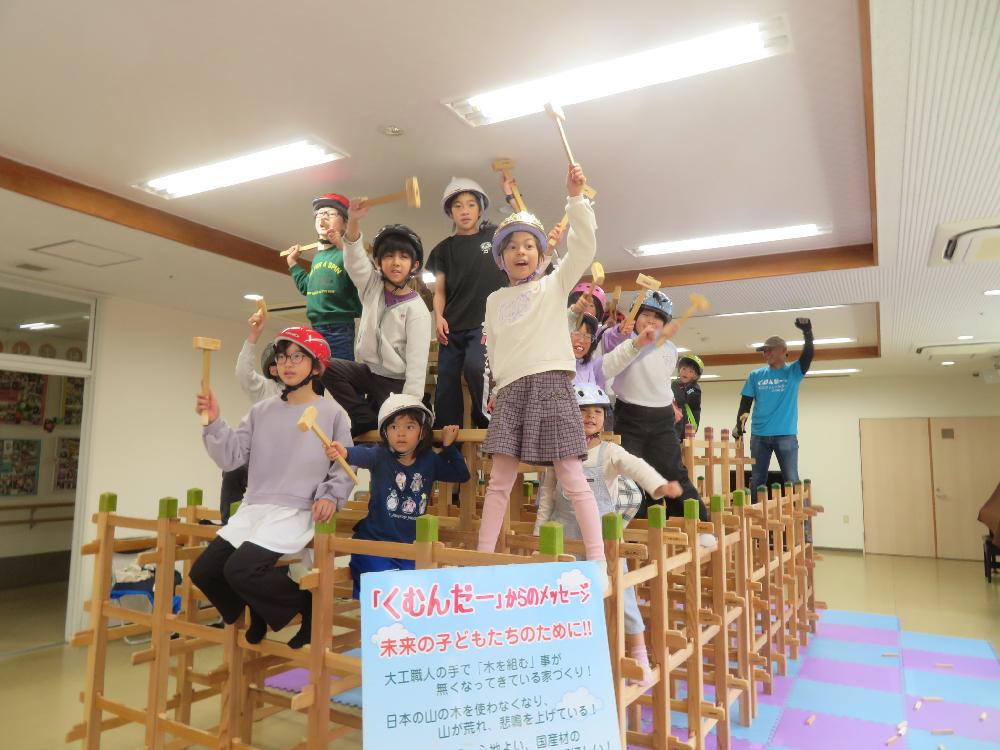 国産材でできた柱や横材を組んで楽しむ木育玩具です。優しい木目や匂い、肌触り、木づちがひびく心地よい音などを五感をとおして木のぬくもりを感じながらみんなで協力して大きなジャングルジムを組み立てました。