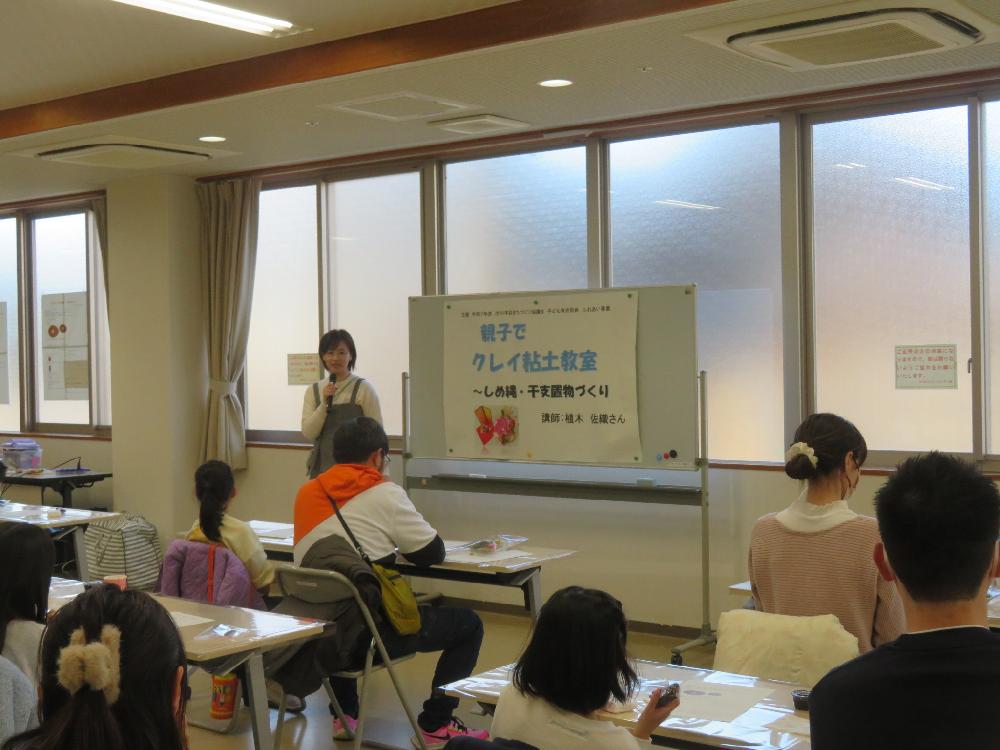 12月6日(土曜)に子ども育成部会主催でふれあい事業「親子でクレイ粘土教室」を開催し40名の参加がありました。講師にクレイ粘土作家の植木佐織さん、奥田真由美さんを迎え、きめ細やかで壊れにくく良く伸びるクレイ粘土を使って「芍薬の花で作るしめ縄」と「干支の置物」を作りました。