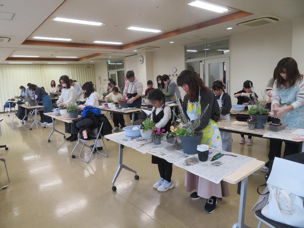 各自で苗の配置を考えたり土に触れたりして1つの鉢に何種類かの植物を一緒に植えて、季節の花を楽しむことができました。家で美しく育てるポイントを教わりました。これからお世話をし、苗が大きく育ってゆく様子を楽しんでいただければと思います。