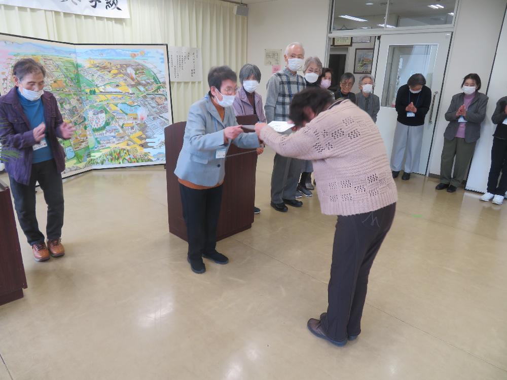 閉講式では、川那部運営委員長とまち協事務局長からの挨拶のあと、皆出席賞の表彰を行いました。今年度は18人の受講生が休まず受講されました。