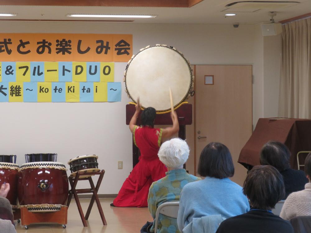 閉講式のあと、「和太鼓&フルートDUO鼓笛大維~kotekitai~」和太鼓演奏者・てんびん太鼓塾長の細田佳揮さん、フルート奏者の土佐 友理咲さんをお迎えして、クラッシック名曲メロディーや日本の歌など演奏していただきました。日本の伝統楽器である和太鼓が持っている大きな力強い演奏で心にとても響きました。またフルートの優美な音色と融合した演奏に聞き入っていました。