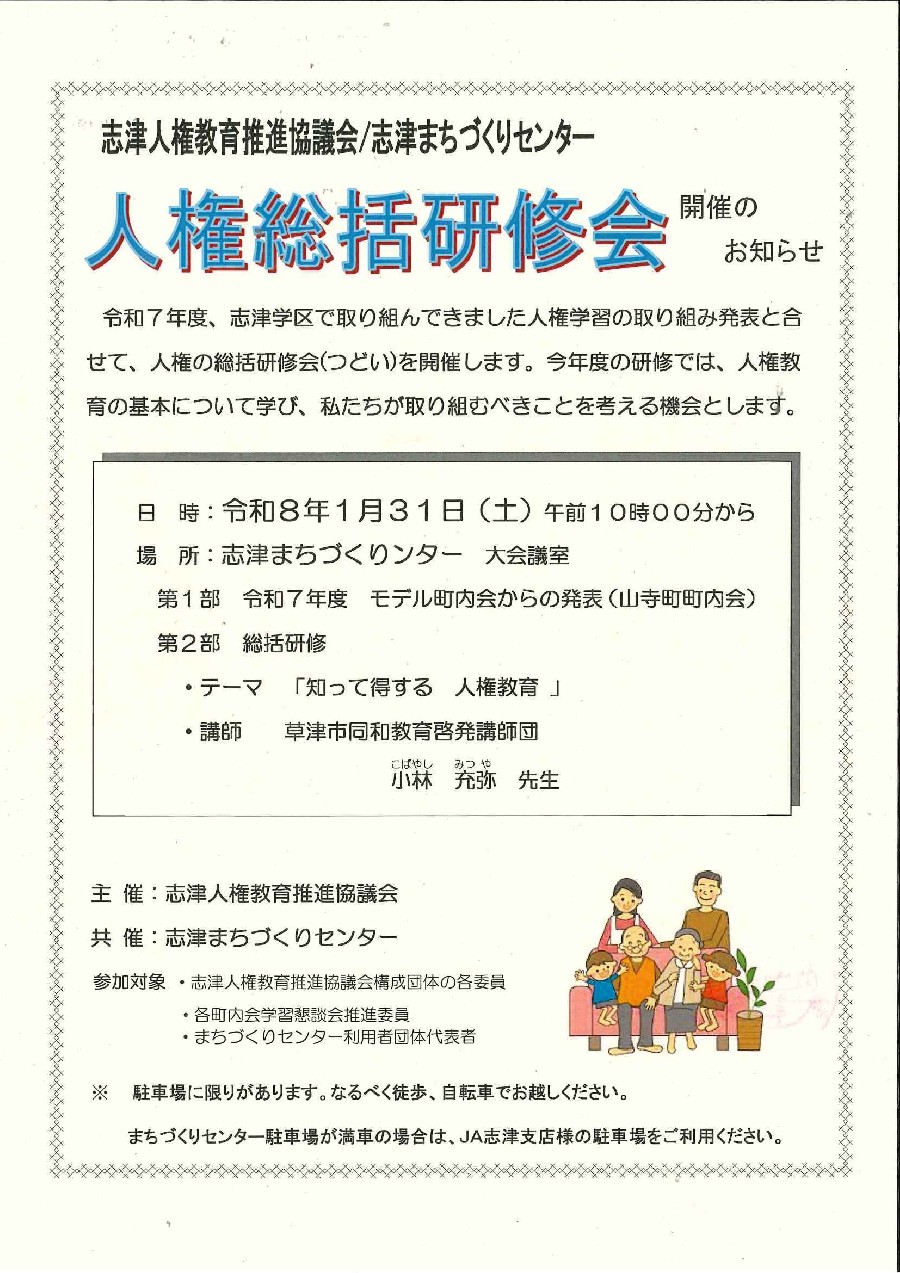 志津人権教育推進協議会と志津まちづくりセンターでは、令和8年1月31日(土)10時から志津まちづくりセンターを会場に、令和7年度の人権総括研修会(つどい)を開催します。つどいの第1部では、今年度のモデル町内会として取り組みをされた山寺町町内会からの発表があり、第2部の総括研修では、草津市同和教育啓発講師団として活躍をされています小林 充弥先生から、「知って得する 人権教育」と題してご講和をいただきます。