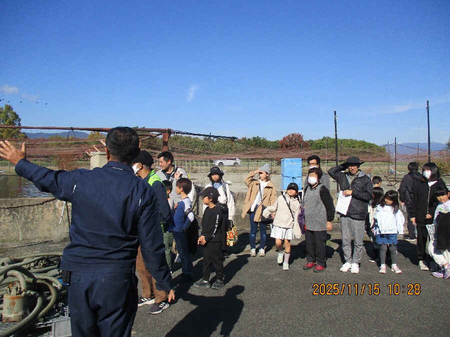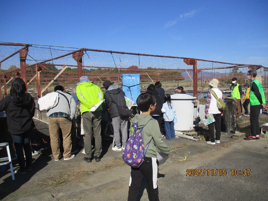 職員の方から説明を受け実際に魚を育てている施設も見学しました。