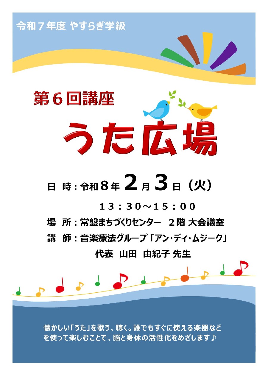 ・開催日 2月3日(火)・時 間 13:30~15:00・場 所 常盤まちづくりセンター(2階 大会議室)・講 師 音楽療法グループ「アン・ディ・ムジーク」